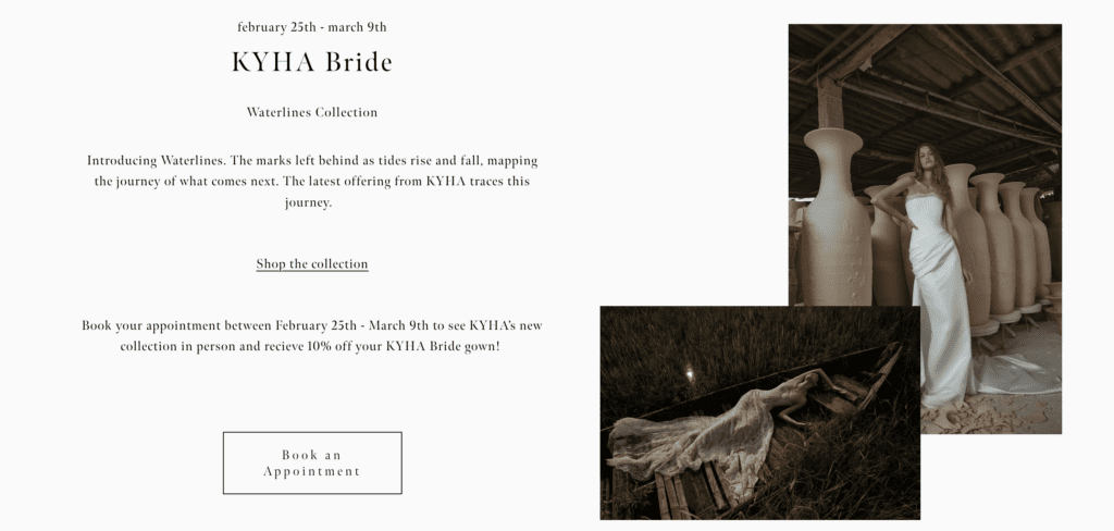 When you book your appointment during the Trunk Show, from February 25th – March 9th, you’ll receive 10% off your KYHA Bride gown!
