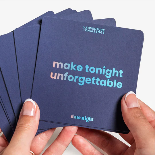 The box contains 8-10 scratch-off cards to guide you on one complete date night. There are instruction cards for activities and experiences, partner prompts to help you surprise each other, connection questions to deepen your relationship, and “Level Up” cards–optional add-ons to make your date even more of an adventure. It’s the perfect way to deepen your connection!