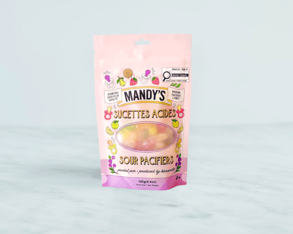 - Sour Pacifiers: Playful shapes, grown-up sour. These Swedish sour pacifiers deliver a crisp, tart tang and a smooth fruit finish in Apple, Orange, Black Currant, Strawberry, Pear, and Lemon. Small in size, big on flavour.