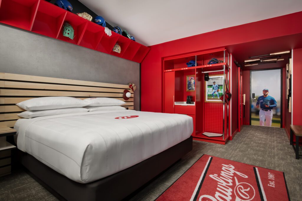 Player-style lockers hold bats, gloves, helmets, and photos, while dugout-style storage above the king-size bed and baseball-inspired lighting bring the professional game feel straight into the room.