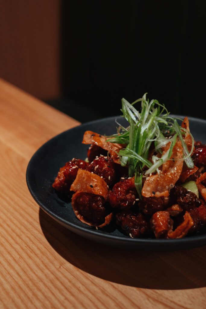 Shareable plates, including General Wow’s Chicken finished with a sweet chili glaze and wonton crisps, and a generously portioned Spinach and Feta Dip, reinforce the restaurant’s social, group-friendly approach to dining.