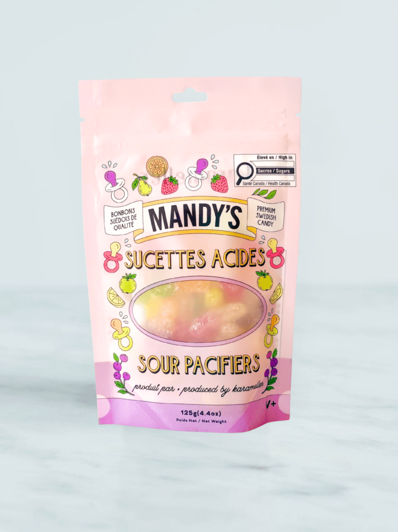 - Sour Pacifiers: Playful shapes, grown-up sour. These Swedish sour pacifiers deliver a crisp, tart tang and a smooth fruit finish in Apple, Orange, Black Currant, Strawberry, Pear, and Lemon. Small in size, big on flavour.