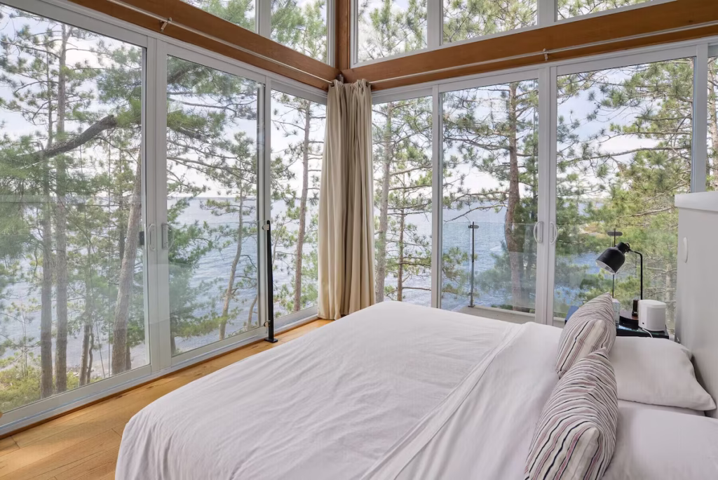 The “Modern Muskoka Home” is the perfect place to unwind and soak in all that greater Muskoka area has to offer. With five bedrooms, this stay can fit up to eight adults comfortably and features luxe upscale bedding, artfully-designed interiors with a cozy fireplace, and gorgeous views from the backyard. The home is filled with beautiful glass exteriors and has built in a feeling of a stay at a luxurious treehouse.